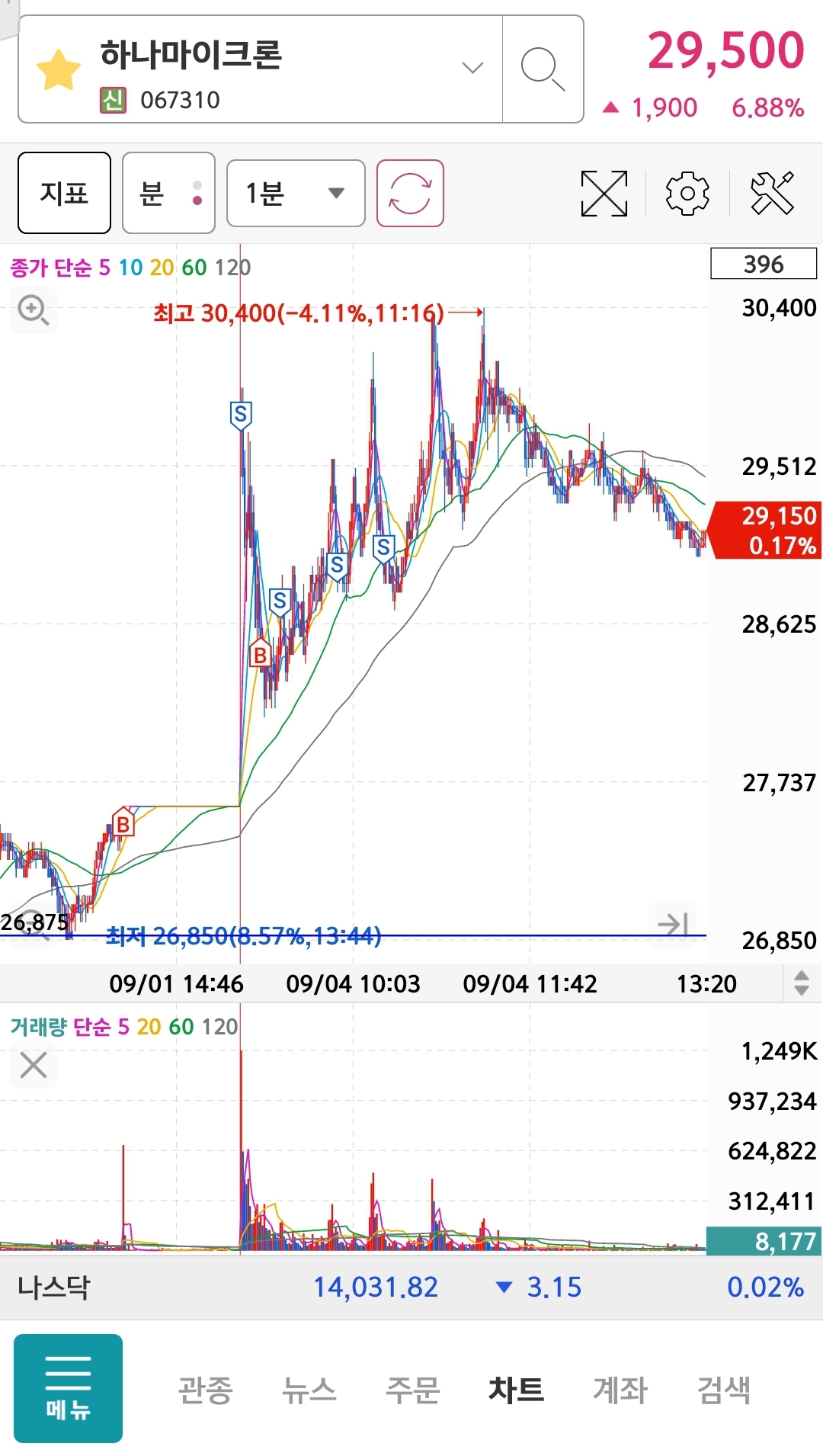 : 전일 상따해온 하나마이크론을 시초에 갭을 보고 매도하고 눌림에서 매수하여 약 익절함, 저점판독기...