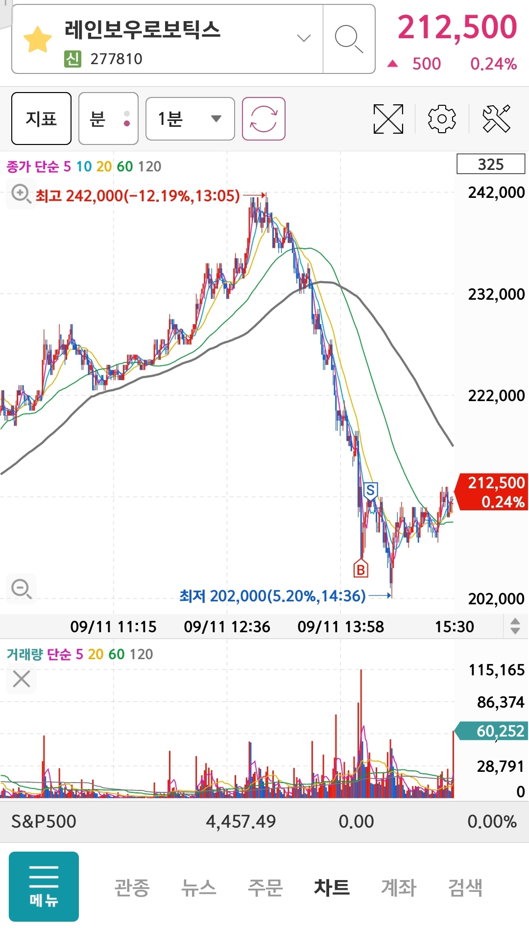 - 에스피시스템즈 상한가에 이어 2등으로 상한가를 가는 모습을 보였으나, 레인보우 큰 하락에 에스피시스템은 상한가 이탈하였음에도 상한가를 지켜서 매수를 걸었는데 바로 깨짐;;;ㅎ